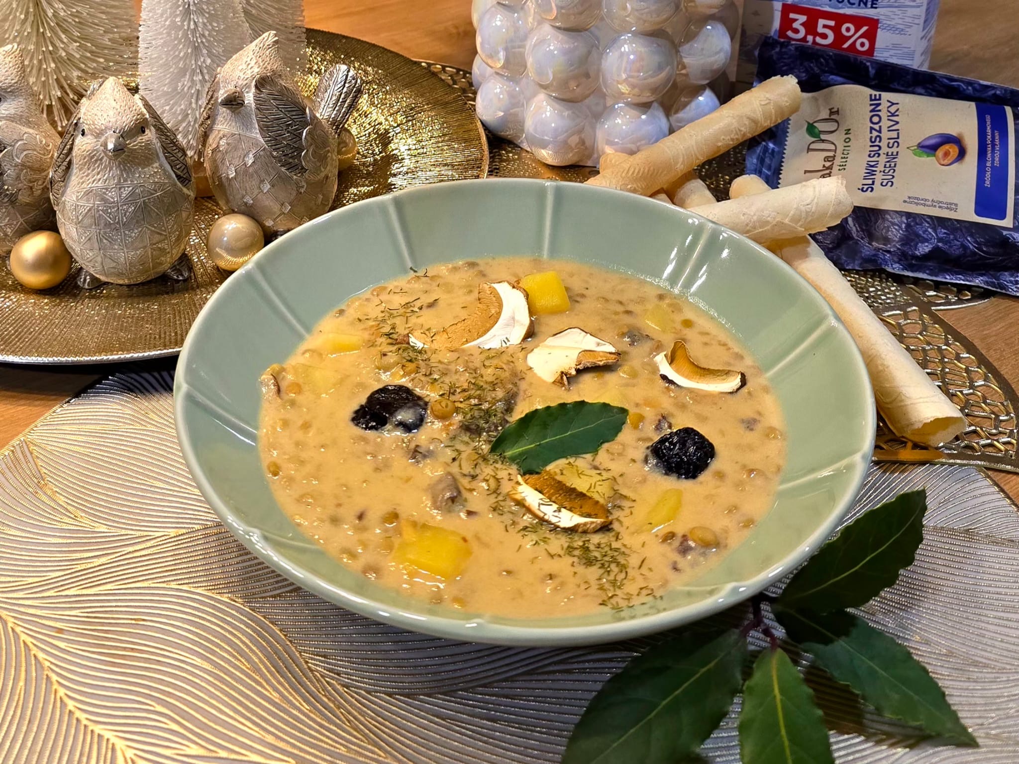 Na masle si osmažte cibuľku a nastrúhaný cesnak do zlatista, pridajte vopred namočené hríby a nechajte chvíľu rozvoňať. Pridajte dobre premytú šošovicu, vopred namáčať ju netreba, nakrájané zemiaky, zemiaky v celku, bobkové listy, čierne korenie, sušené slivky a celé to zalejte vodou a nechajte variť. Zemiaky v celku vyberte aj s trochou uvarene šošovice a rozmixujte – vlejte nazad do polievky, zahustíte ju tým aj bez múky. Na záver pridajte kyslú smotanu s mliekom a dochuťte zohriatym octom, aby sa polievka nezrazila. Osoľte a oslaďte podľa chuti a podávajte.
