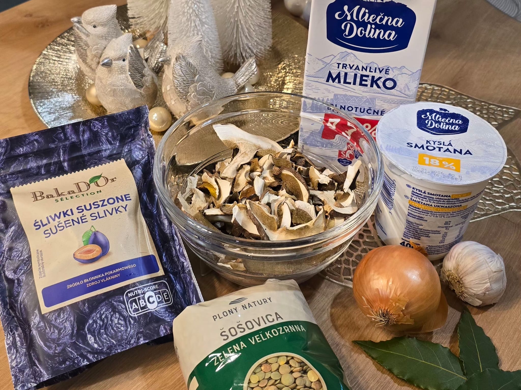 Na jej prípravu použil Kyslú smotanu Mliečna dolina, 400 g za 1, 49 €, Šošovicu zelenú veľkozrnnú Plony natury, 500 g len za 0,99 € a spestril ju Sušenými slivkami Baka D‘Or.
